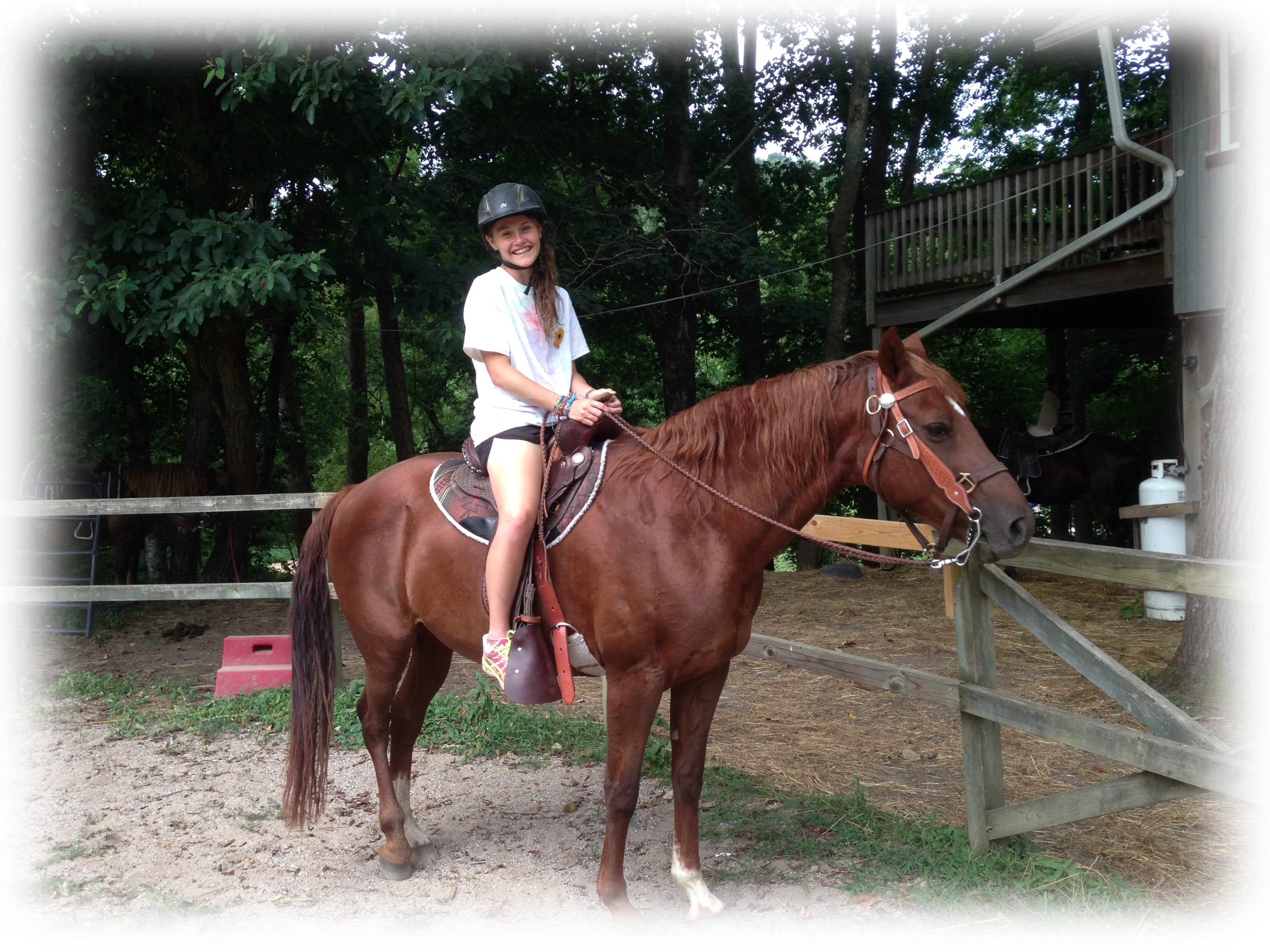 up like little hitchhikers jump in the back of our boots. Sweat is already seeping into our socks to join the water sloshed in there that morning while we were filling eight individual buckets. We’re about to take a test ride around the arena to see if we dare leave the safety of the sand and the security of the fencing. And, it is now when the stress level slowly begins to creep its way up.